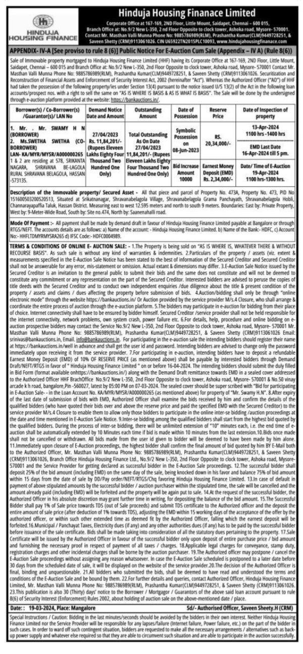 | Contact Details: | Contact The Authorized Officer: Mr. Masthan Valli Munna - 9885786989(RLM) Prashantha Kumar - 9449728251 & Saveen Shetty - (CRM)9113061026 |
