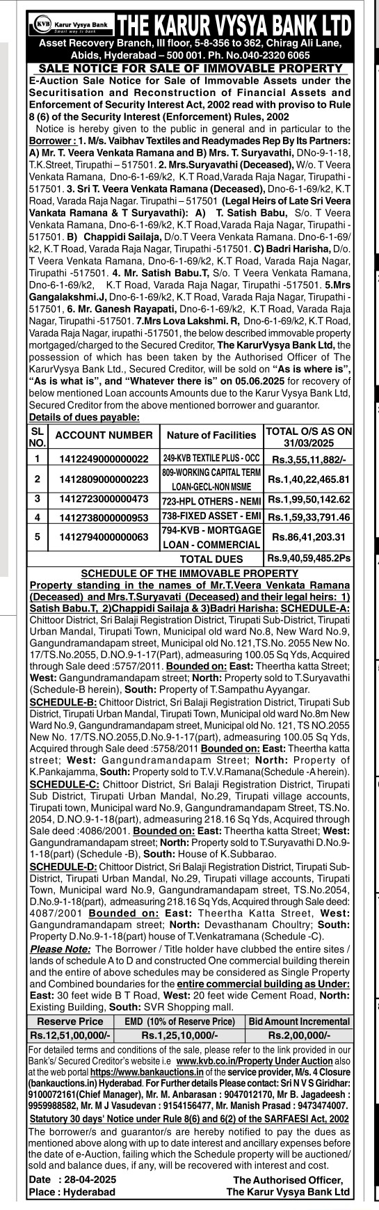 | Schedule of Property: | SCHEDULE OF THE IMMOVABLE PROPERTY Property standing in the names of Mr.T.Veera Venkata Ramana (Deceased) and Mrs.T.Suryavati (Deceased) and their legal heirs: 1) Satish Babu.T, 2) Chappidi Sailaja & 3)Badri Harisha: SCHEDULE-A: Chittoor District, Sri Balaji Registration District, Tirupati Sub-District, Tirupati Urban Mandal, Tirupati Town, Municipal old ward No.8, New Ward No.9, Gangundramandapam street, Municipal old No. 121, TS.No. 2055 New No. 17/TS.No.2055, D.NO.9-1-17 (Part), admeasuring 100.05 Sq Yds, Acquired through Sale deed : 5757/2011. Bounded on: East: Theertha katta Street; West: Gangundramandapam street; North: Property sold to T.Suryavathi NOTE : Full Description Available in Sale Notice |