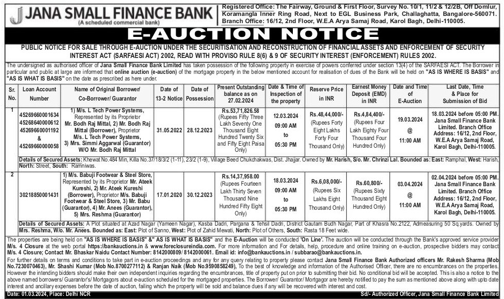 | Start Date and Time of Auction: | 03-04-2024 11:00 am |