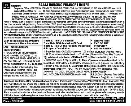 | Contact Details: | Contact The Authorized Officer: Ajay Mittal, Emall ID: ajay mittal@bajajhousing.co.in , Mob No. 9855733149/9896531846 |