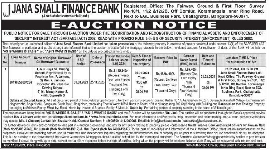 | Contact Details: | Contact the Authorised Officer : Mr. Ranjan Naik (Mob No.9590858249), Mr. Umesh (Mob No.8050149617) & Mrs. Syeda (Mob No.7400445147). |