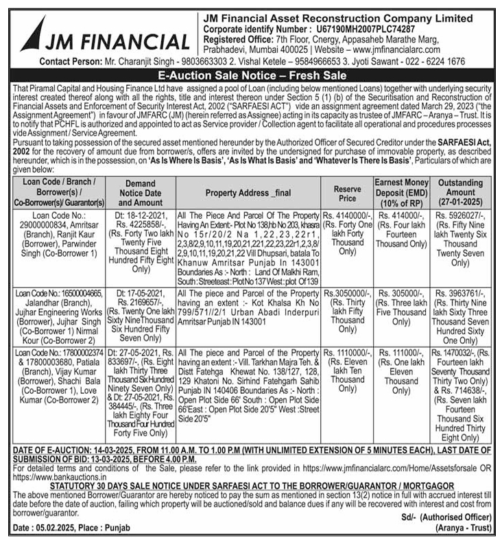 | Contact Details: | Contact the Authorized Officer : 1. Mr. Charanjit Singh - 9803663303 2. Vishal Ketele - 9584966653 3. Jyoti Sawant - 022 - 62241676. |