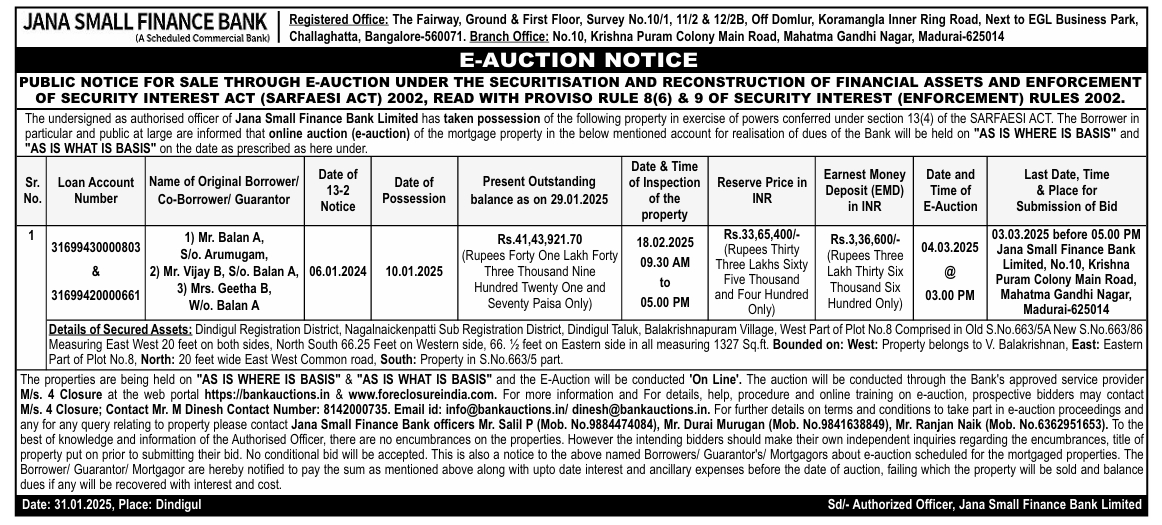 | Contact Details: | Contact the Authorized Officer : Mr. Salil P (Mob. No.9884474084), Mr. Durai Murugan (Mob. No.9841638849), Mr. Ranjan Naik (Mob. No.6362951653). |