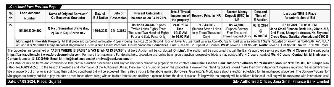 | Schedule of Property: | Mortgaged Immovable Property: At District Bharuch Sub Dist Ankleshwar Muje Jitali, R.S No 183 PaikiAalishan City Plot Area-4 15 Varade-27.91 sq mtrs Total 68.08 sq mtrs |