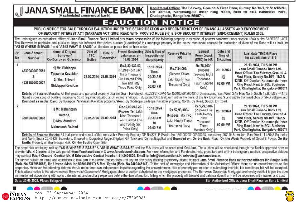 | Contact Details: | Contact The Authorized Officer: Mr. Ranjan Naik(Mob. No.6362951653), Mr. Umesh (Mob. No.8050149617) & Mrs. Syeda (Mob. No.7400445147). |