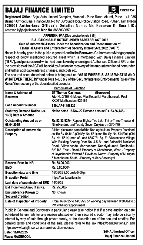 | Contact Details: | Contact The Authorized Officer::Mr. Kesavan K,8668030659 |