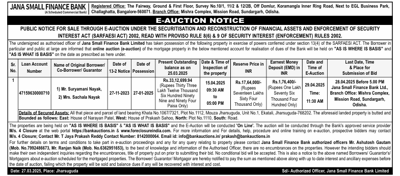 | Schedule of Property: | All that piece and parcel of land bearing Khata No.1067/7321, Plot No 1112, Mouza Jharsuguda, Unit No.1, Ekatali, Jharsuguda-768202. The aforesaid landed property is butted and Bounded as follows: East: House of Narayan Patel, West: House of Prakash Sahoo, North: Plot No.1110, South: Road |