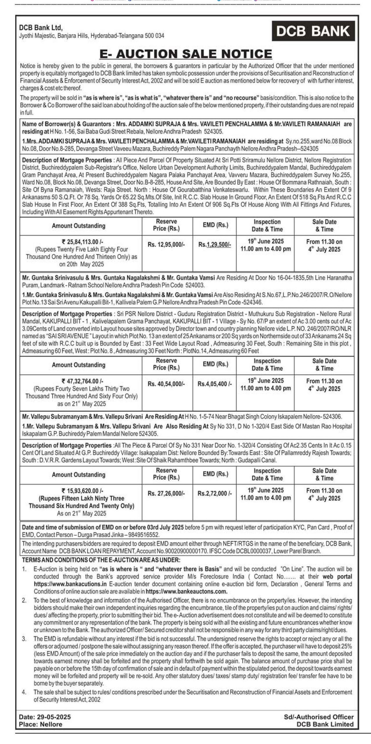 | Contact Details: | Contact The Authorized Officer: Mr Durga Prasad Jinka - 9849516552 |
