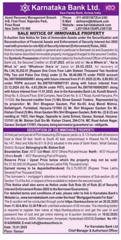 | Schedule of Property: | All that part and parcel of Plot measuring 250 sqaure yardsi.e, 8-1/3 marla with dimensions East to West 50 feet, North to South 45 feet, compromised in Khewat No.74, Khata No. 147. Rect and Killa No.61/19 (8-0) situated in the area of Garhi Kesri, Tehsil Ganaur, District: Sonipat, Belonging to Mr. Bishan Dutt Boundaries: East: 500" Gall West: 50'0" Others Plot and House North: 45'0' House of Others South: 45 0 Remaining Part of Property |