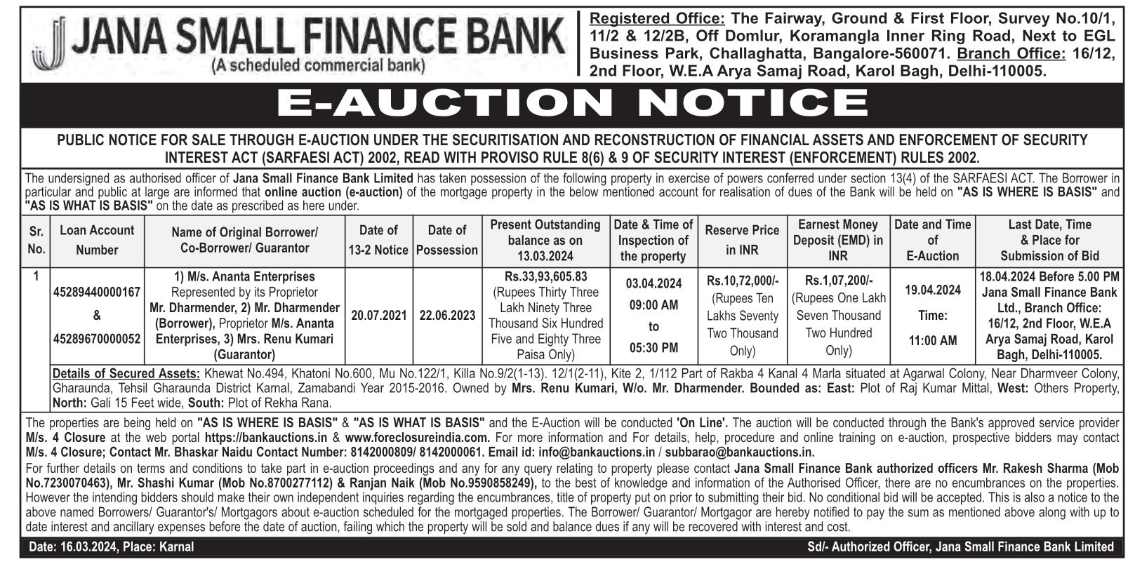 | Contact Details: | Contact Authorized Officer : Mr. Rakesh Sharma (Mob No.7230070463), Mr. Shashi Kumar (Mob No.8700277112) & Ranjan Naik (Mob No.9590858249) |
