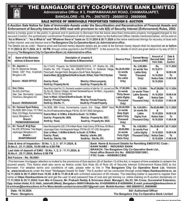 | Contact Details: | Contact The Authorized Officer : 080-26600512/ 26609066 |