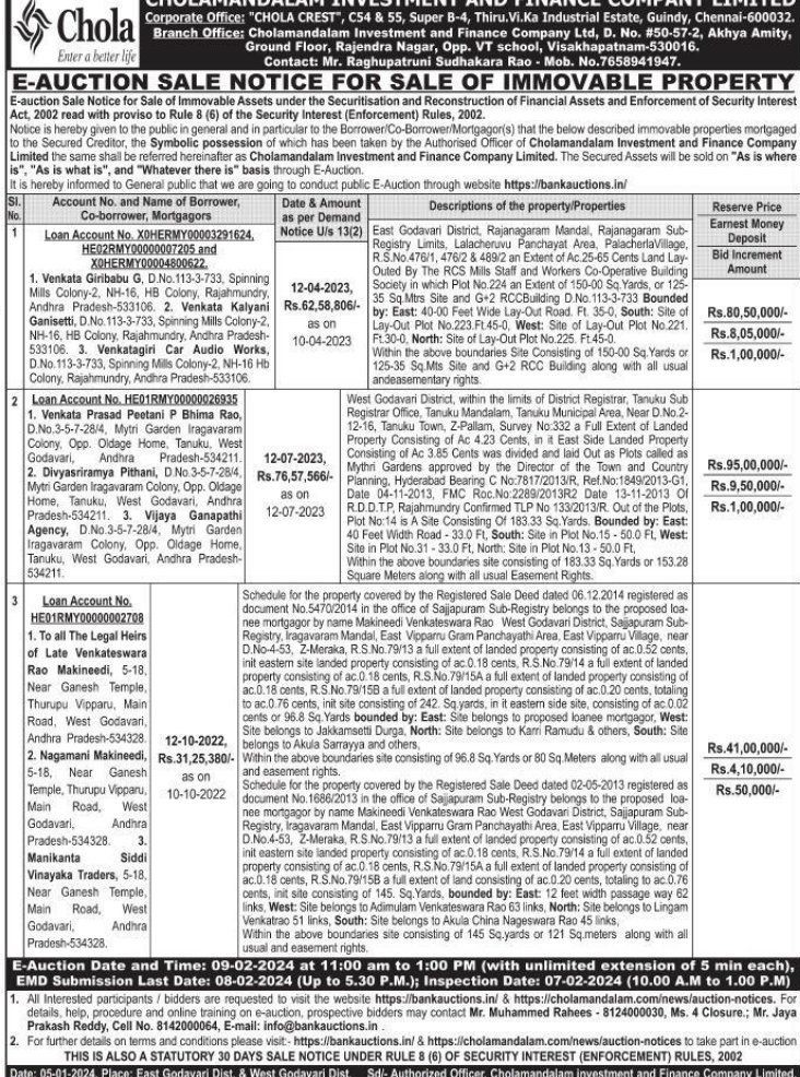 | Contact Details: | Contact The Authorized Officer: Contact: Mr. Raghupatruni Sudhakara Rao . Mob. No.7658941947, Mr. Muhammed Rahees - 8124000030, |