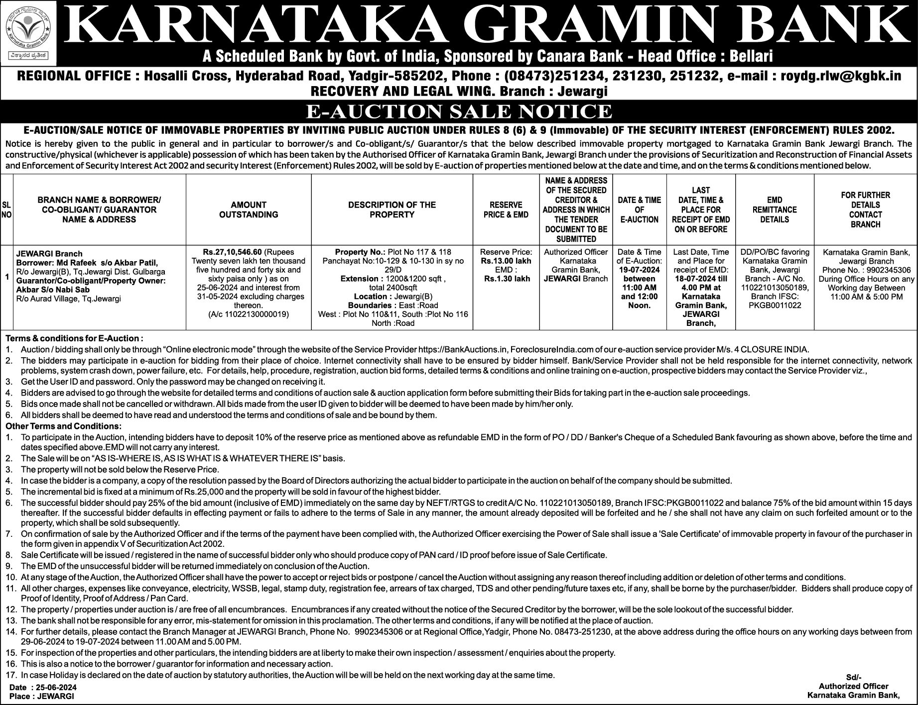 | Contact Details: | Contact The Authorized Officer Phno : 08473-251234,231230, 251232 , 9902345306, 08473-251230 Email:- roydg.rlw@kgbk.in |