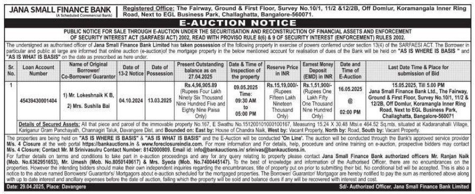 | Contact Details: | Contact The Authorized Officer : Mr Ranjan Naik 6362951653, Mr Umesh 8050149617, Mrs Suyeda Syeda 7400445147 |
