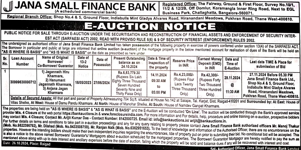 | Contact Details: | Contact The Authorized Officer : Mr. Manoj Thakur 9822396792, Mr. Dilshad 8433508759, Mr. Ranjan Naik 6362951653 |
