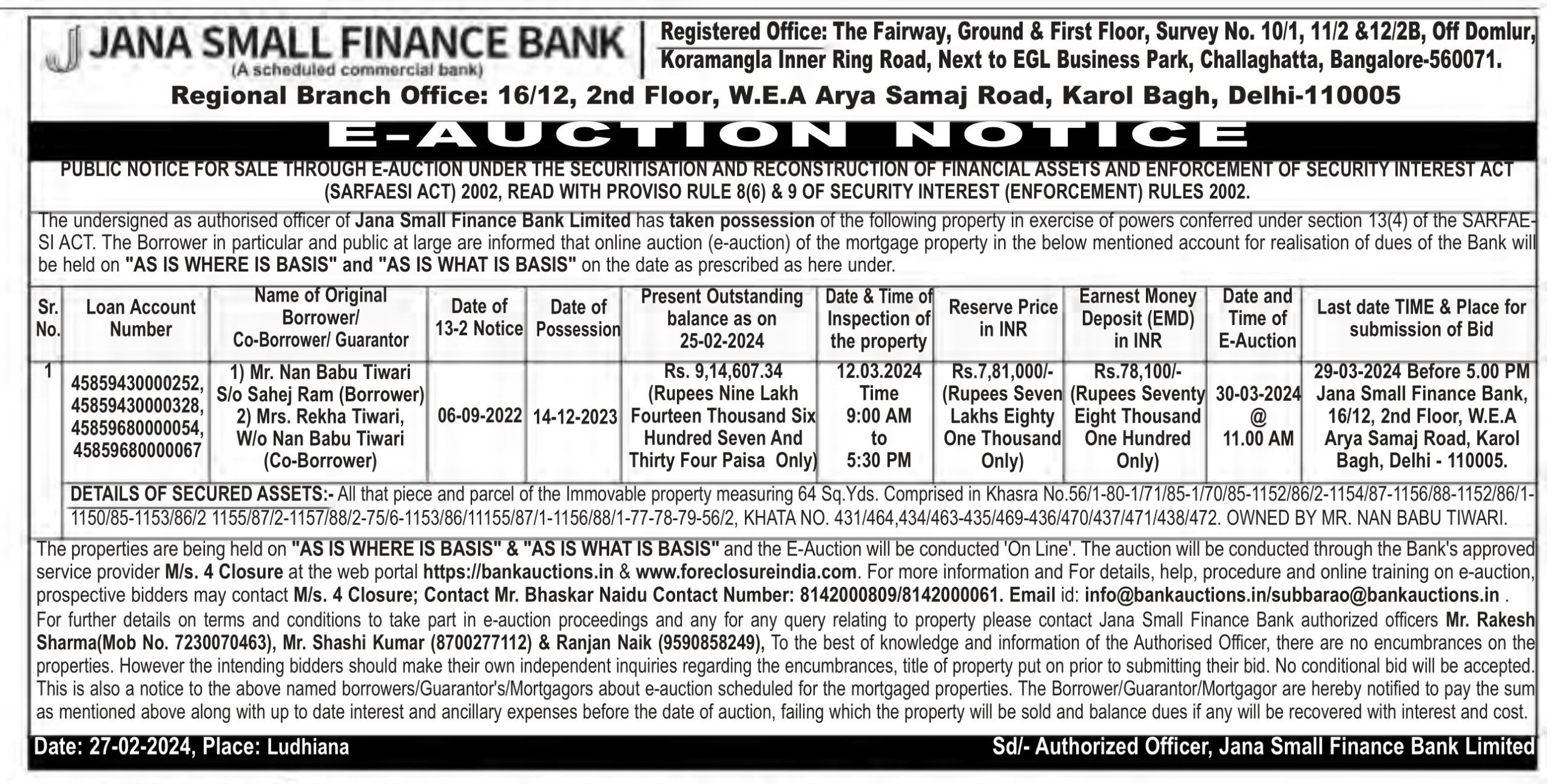 | Contact Details: | Contact Authorized Officer: Mr. Rakesh Sharma(Mob No. 7230070463), Mr. Shashi Kumar (8700277112) & Ranjan Naik (9590858249), |