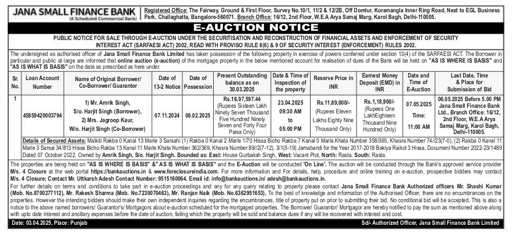 | Schedule of Property: | Details of Secured Assets Malkit Rakba 0 Kanal 13 Marie 3 Sarsahi 1 Rakba 0 Kanal 2 Marle 1/70 Hissa Bicho Rakba 7 Kanal 0 Maria Khata Number 358/365, Khasra Number 74/23 7 0 , 2 Rakba 0 Kanal 11 Marie 3 Sarsal 34/813 Hissa Bicho Rakba 13 Kanal 11 Marie Khata Number 362/369, Khasra Number 89/2 7-12, 3/1/5-19 Jamabandi for the Year 2017-2018 Bakiya Raikot 3 Hissa. Document Number 2022-23/1489 Dated 07 October 2022. Owned by Amrik Singh, S o. Harjit Singh. Bounded as East House Gurbaksh Singh, West Vacant Plot, North Rasta, South Rasta |