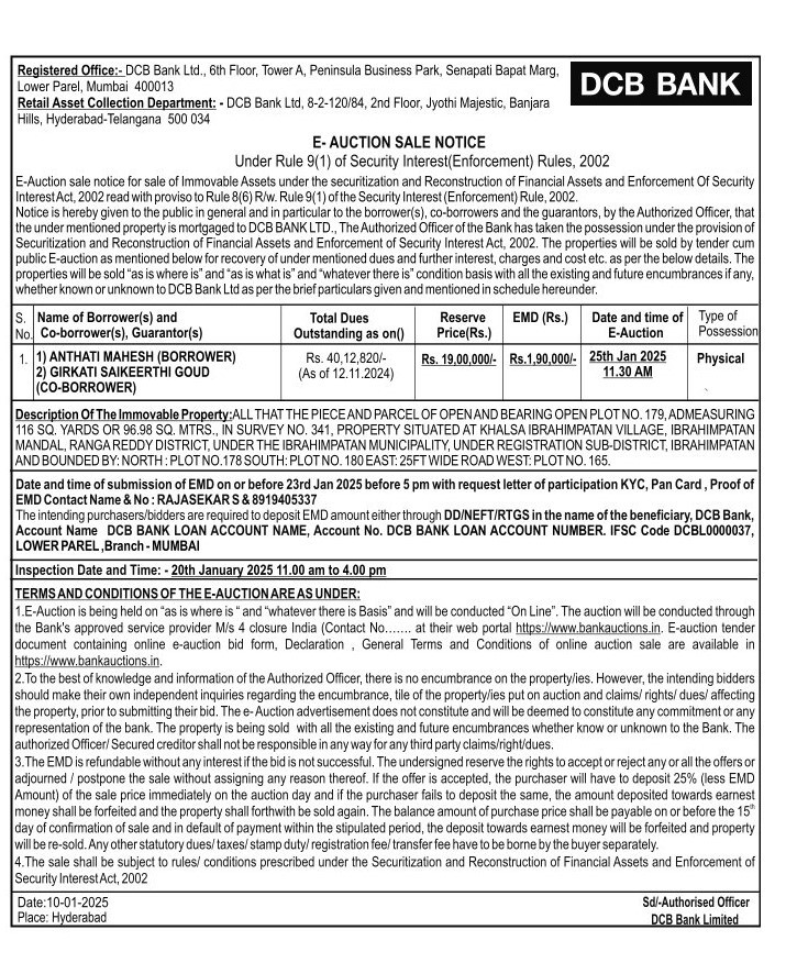 | Schedule of Property: | ALL THAT THE PIECE AND PARCEL OF OPEN AND BEARING OPEN PLOT NO. 179, ADMEASURING 116 SQ. YARDS OR 96.98 SQ. MTRS., IN SURVEY NO. 341, PROPERTY SITUATED AT KHALSA IBRAHIMPATAN VILLAGE, IBRAHIMPATAN MANDAL, RANGA REDDY DISTRICT, UNDER THE IBRAHIMPATAN MUNICIPALITY, UNDER REGISTRATION SUB-DISTRICT, IBRAHIMPATAN AND BOUNDED BY: NORTH: PLOT NO.178 SOUTH: PLOT NO. 180 EAST: 25FT WIDE ROAD WEST: PLOT NO. 165 |