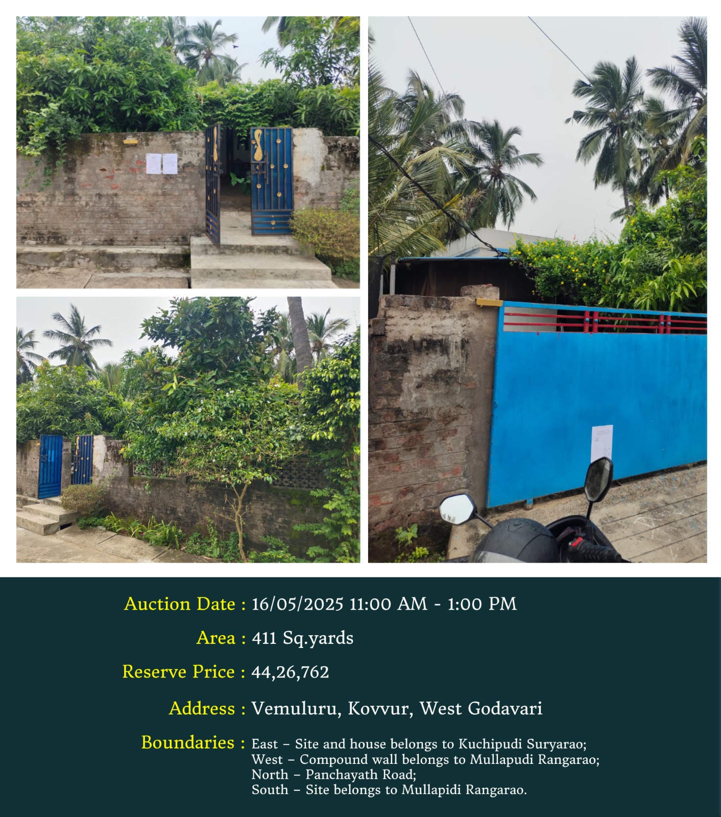 | Schedule of Property: | All the piece and parcel of RS No. 75/2A D No. 1-68 Assessment No.63 Vemuluru Village Vemuluru Gram Panchayath Area Kovvur Mandal Kovvur Sro West Godavari Dist Andhra Pradesh 534350 Along With Proportionate Share In Common Areas (Area Adm. 411 Sq. Yards.) Bounded as: On East- Site And House Belongs To Kuchipudi Suryarao; On West- Compound Wall Belongs To Mullapudi Rangarao; On North- Panchayath Road; On South- Site Belongs To Mullapidi Rangarao |