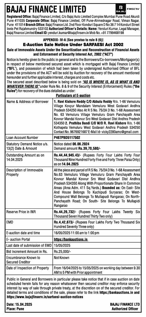 | End Date and Time of Auction: | 16-05-2025 1:00 pm |