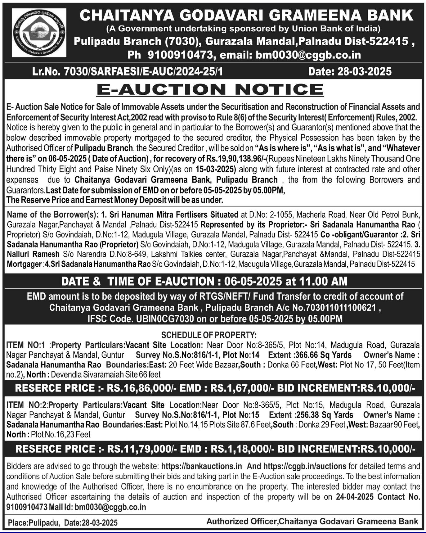| Start Date and Time of Auction: | 06-05-2025 11:00 am |