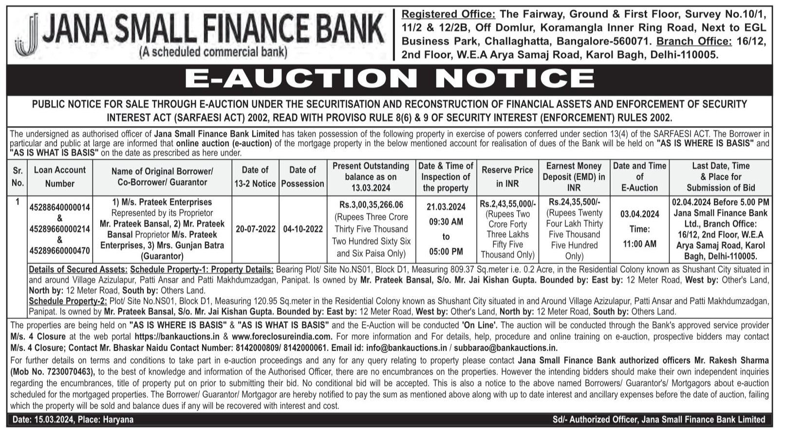 | Contact Details: | Contact Authorized Officer: Mr. Rakesh Sharma (Mob No. 7230070463), |