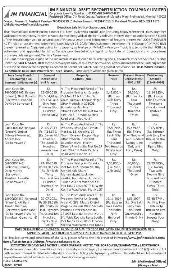 | Contact Details: | Contact The Authorized Officer: 1. Prashant Pandey-7054013999, 2. Rohan Sawant-9833143013, 3. Prashant Monde-022-6224 1676 Website-www.jmfinancialarc.com |