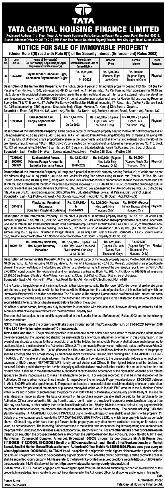 | Contact Details: | Contact The Authorized Officer: Mr.Manish Bansal, Email Id Manish.Bansal@tatacapital.com Mobile No 8588983696 ,9999078669 |