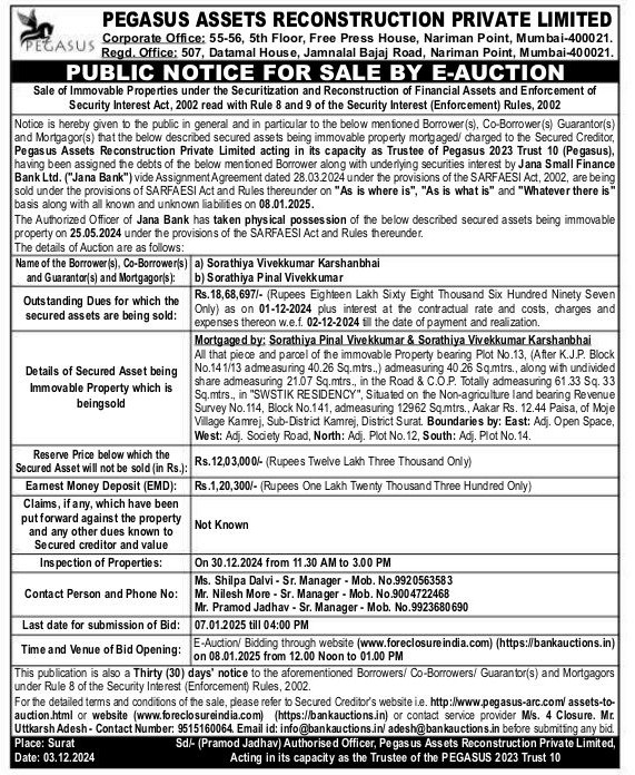 | Schedule of Property: | Mortgaged by: Sorathiya Pinal Vivekkumar & Sorathiya Vivekkumar Karshanbhai All that piece and parcel of the immovable Property bearing Plot No.13, (After K.J.P. Block No.14 1/13 admeasuring 40.26 Sq.mtrs.,) admeasuring 40.26 Sqmtrs., along with undivided share admeasuring 21.07 Sq.mtrs., in the Road & C.O.P. Totally admeasuring 61.33 Sq. 33 Sq.mtrs., in "SWSTIK RESIDENCY", Situated on the Non-agriculture land bearing Revenue Survey No. 114, Block No.141, admeasuring 12962 Sq.mtrs., Aakar Rs. 12.44 Paisa, of Moje Village Kamrej, Sub-District Kamrej, District Surat. Boundaries by: East: Adj. Open Space, West: Adj. Society Road, North: Adj. Plot No. 12, South: Adj. Plot No. 14. |