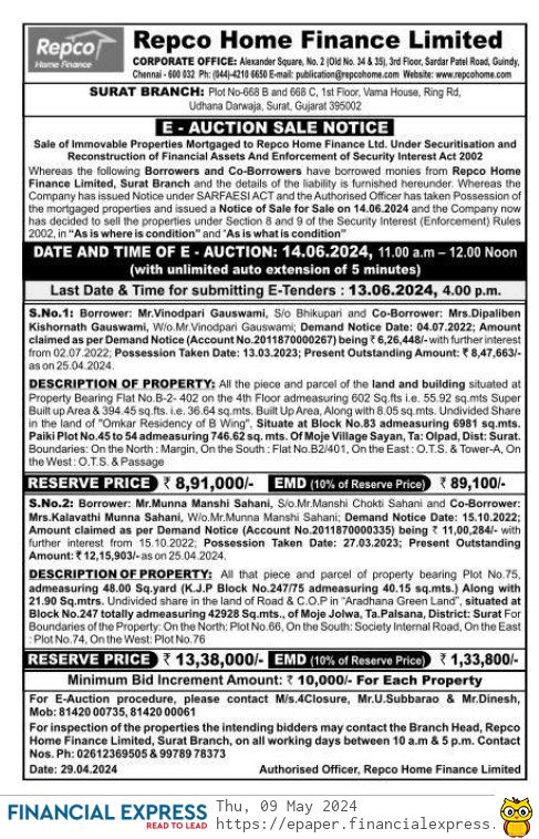 | End Date and Time of Auction: | 14-06-2024 12:00 pm |