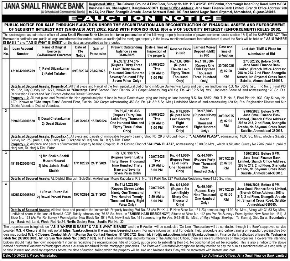 | Schedule of Property: | All that piece and parcel of the immovable Property bearing Plot No. 23 (As Per K. J. P. New Block No. 151-23) admeasuring 44.99 Sq. Mtrs., Along with 31.53 Sq. Mtrs., undivided share in the land of Road & COP, Totally admeasuring 76.52 Sq. Mtrs., in "SHREE HARI RESIDENCY", Situate at Block No. 112 (As Per Re-Survey / Promulgation New Block No. 151), & Block No. 123 (As Per Re-Survey/Promulgation New Block No. 151) Paiki New Block No. 151 admeasuring He. Are. 0-52-58 Sq. Mtrs., of Moje Village Shekhpur, Ta. Kamrej, Dist. Surat. Boundariec by:- East: Adj. Land, West: Plot No.24, North: Society Road, South: Plot No. 32. |