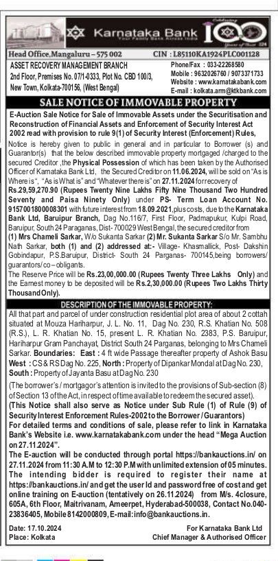 | Schedule of Property: | All that part and parcel of under construction residential plot area of about 2 cottah situated at Mouza Hariharpur, J. L. No. 11, Dag No. 230, R.S. Khatian No. 508 (R.S.), L. R. Khatian No. 15, present L. R. Khatian No. 2383, P.S. Baruipur, Hariharpur Gram Panchayat District South 24 Parganas, belonging to Mrs Chameli Sarkar. Boundaries: East 4 ft wide Passage thereafter property of Ashok Basu West CS&R Dag No. 225, North Property of Dipankar Mondal at Dag No. 230, South Property of Jayanta Basu at Dag No. 230 |