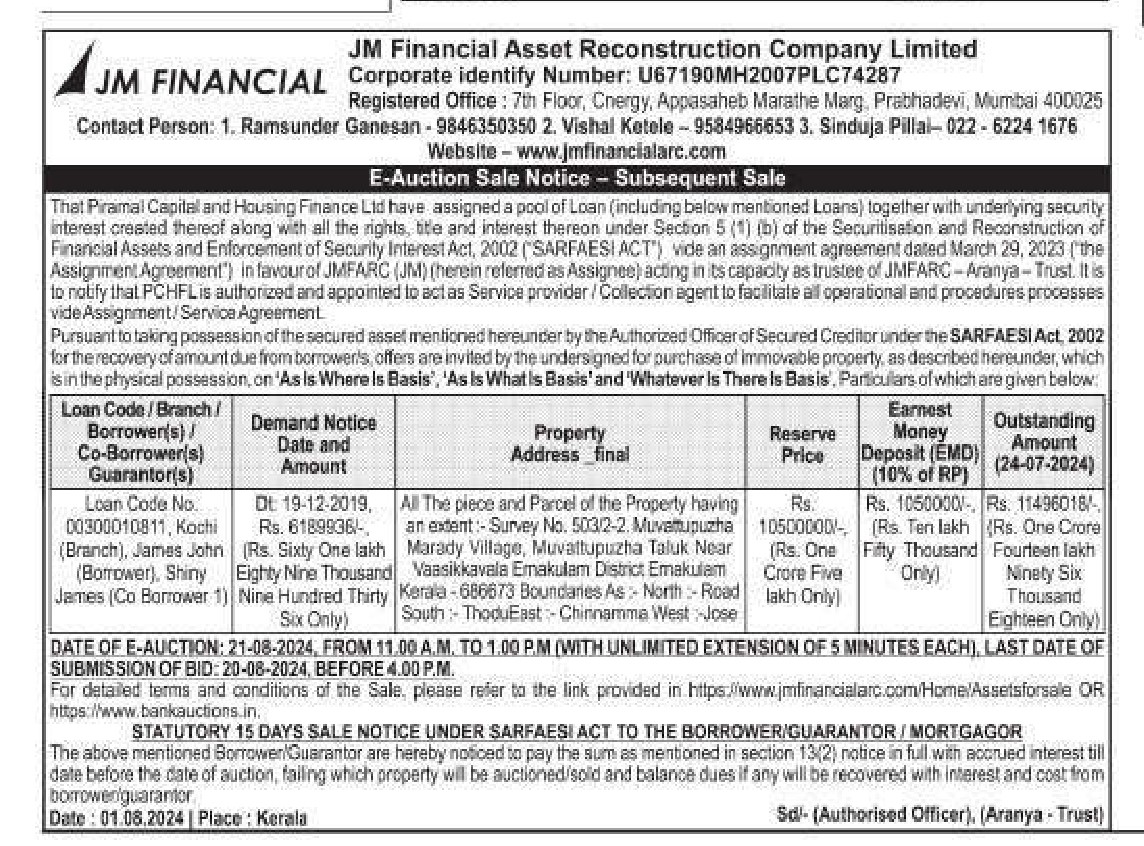 | Contact Details: | Contact The Authorized Officer: Contact Person: 1. Ramsunder Ganesan . 9846350350 2. Vishal Ketele - 9584966653 3. Sinduja Pillal- 022 - 6224 1676 Website - www.jmfinancialare.com |