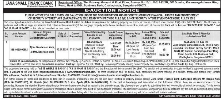 | Contact Details: | Contact The Authorized Officer : Mr Ranjan Naik 6362951653, Mr Umesh 8050149617, Mrs Syeda 7400445147 |