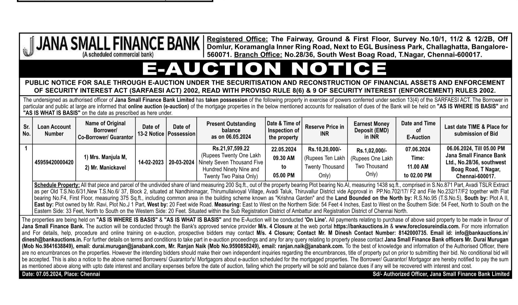 | Contact Details: | Contact The Authorized Officer: Mr. Durai Murugan Ph no: 9841638849, Mr. Ranjan Naik Ph no: 9590858249 |