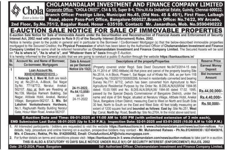 | Contact Details: | Contact The Authorized Officer : Mr. Janardhan 9590490222, Mr. Muhammed Rahees 8124000030, 6374845616 |