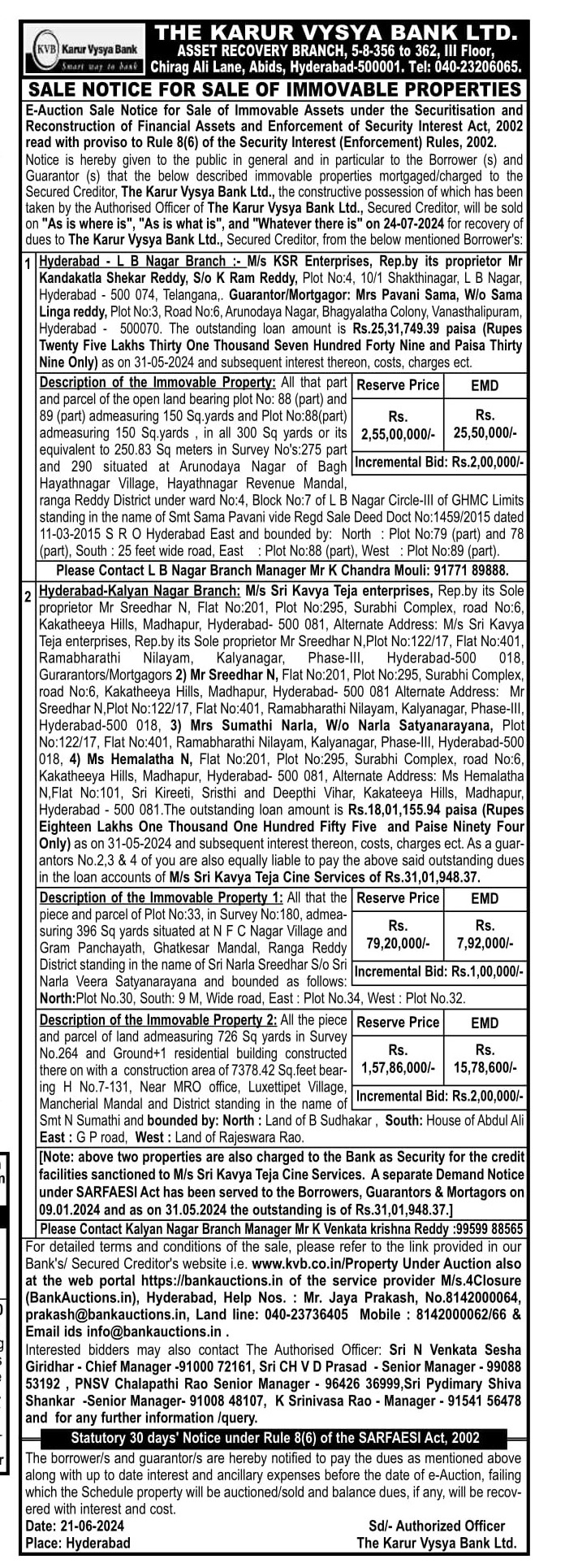| Schedule of Property: | Description of the Immovable Property 1: All that the piece and parcel of Plot No:33, in Survey No: 180, admeasuring 396 Sq yards situated at NFC Nagar Village and Gram Panchayath, Ghatkesar Mandal, Ranga Reddy District standing in the name of Sri Narla Sreedhar S/o Sri Narla Veera Satyanarayana and bounded as follows: North:Plo South: 9 M, Wide road, East : Plot No. 34, West : Plot No.32. |