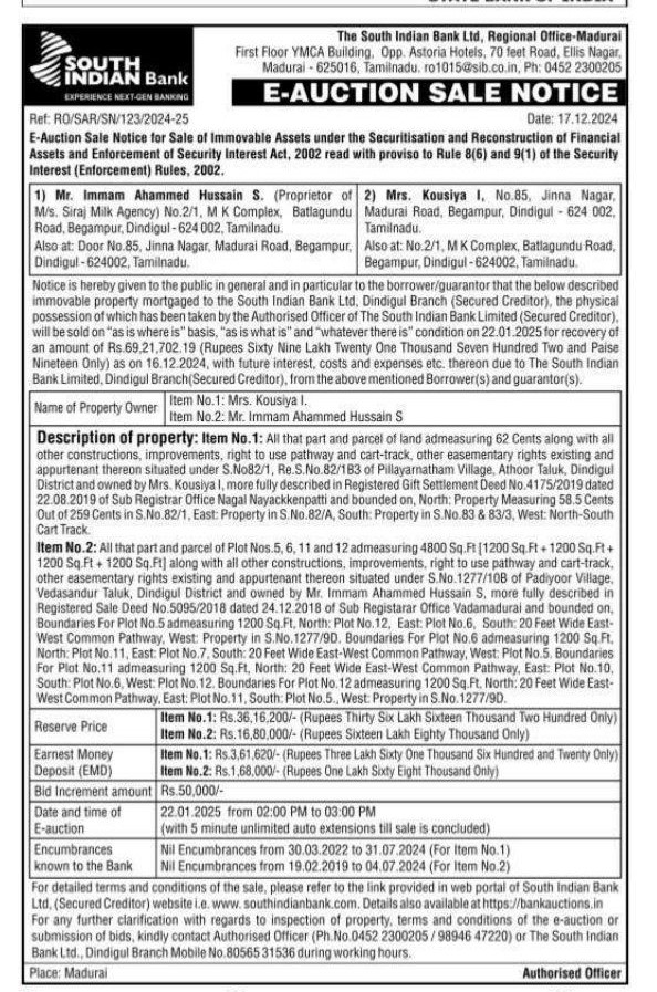 | Inspection Details: | Property Inspection Contact The Authorized Officer: 0452-2300205, 8056531536, 9894647220 |