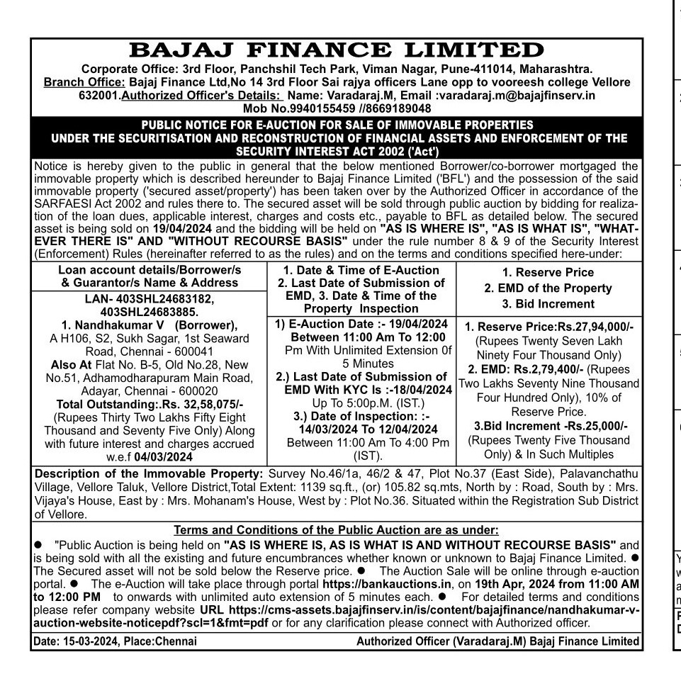 | Contact Details: | Contact Authorized Officer : Varadaraj. M Mob.No.:9940155459 , 8669189048 |