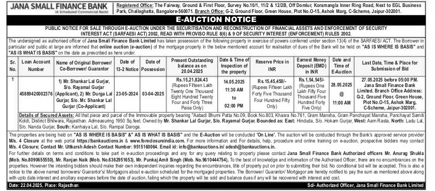 | Schedule of Property: | Details of Secured Assets: All that piece and parcel of the immovable property bearing Aabadi Bhumi Patta No.09. Book No.803, Khasra No.761, Gram Mansha, Gram Panchayat Mansha, Panchayat Samit Kotdi, Distitct Bhilwara, Rajasthan. Admeasuring 1950 Sq.Feet Owned by Mr. Shankar Lal Gurjar, S/o. Rayamal Gurjar. Bounded as: East: Hinduda, S/o. Holikam Gurjar, West: Aam Rasta, North: Ladu La S/o. Nanda Gurjar, South: Kanhaiya Lal, S/o, Rampal Daroga. |