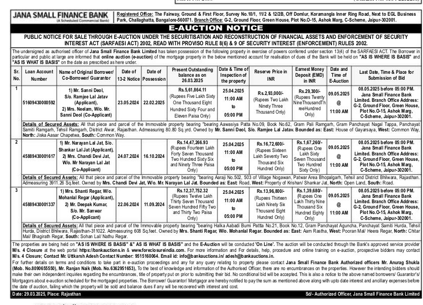 | Schedule of Property: | All that piece and parcel of the Immovable property bearing "bearing Aawasiya Patta No.09 Book No.62, Gram Pali Ramgarh, Gram Panchayat Nagal Tappa, Panchayat Samiti Ramgarh, Tehsil Ramgarh, District Alwar, Rajasthan. Admeasuring 80.80 Sq.yrd. Owned by Mr. Sanni Deol. S/o. Ramjee Lal Jatav. Bounded as: East: House of Gayarsaya. West: Common Way, North: Jiska Aasar Chapetwa South: Common Way. |