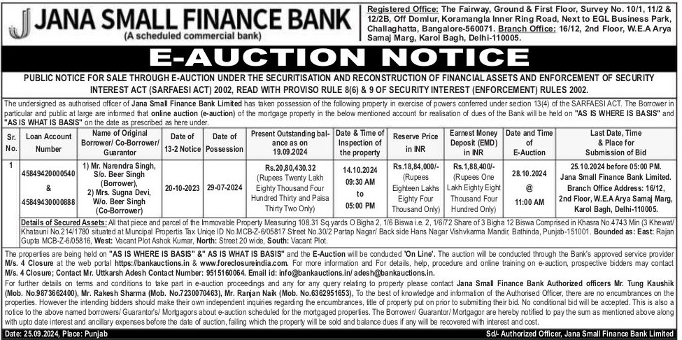 | Schedule of Property: | All that piece and parcel of the Immovable Property Measuring 108.31 Sq.yards 0 Bigha 2, 1/6 Biswa i.e. 2, 1/6/72 Share of 3 Bigha 12 Biswa Comprised in Khasra No. 4743 Min (3 Khewat/Khatauni No. 214/1780 situated at Municipal Properties Tax Unique ID No MCB-Z-6/05817 Street No. 30/2 Partap Nagar/ Back side Hans Nagar Vishvkarma Mandir, Bathinda, Punjab-151001. Bounded as: East: Rajan Gupta MCB-Z-6/05816, West: Vacant Plot Ashok Kumar, North: Street 20 wide, South: Vacant Plot. |