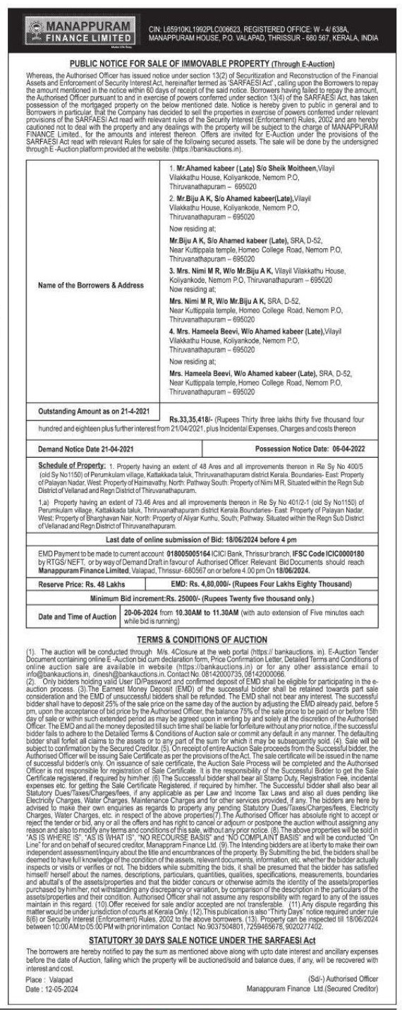 | End Date and Time of Auction: | 20-06-2024 11:30 am |
