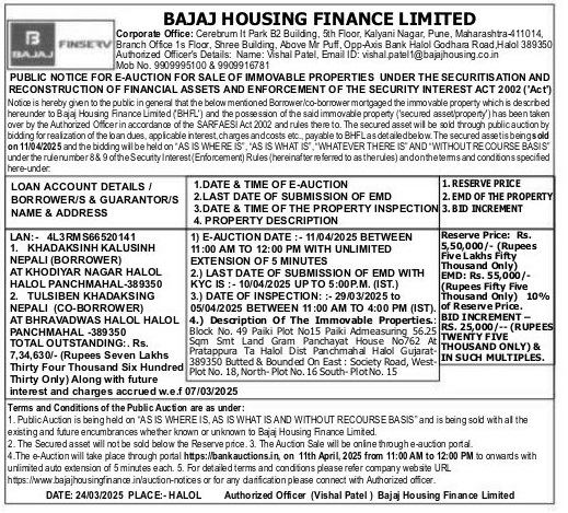 | Contact Details: | Contact The Authorized Officer: Vishal Patel, Email ID: vishal.patel1@bajajhousing.co.in Mob No. 9909995100 & 9909916781 |