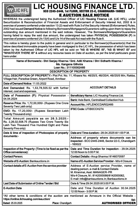 | Schedule of Property: | FULL DESCRIPTION OF PROPERTY:- Plot Pvt No. 11, Khasra No. 46/20/3, 46/20/4, 46//20/5 Min, Rakba, Village Heir, Paradise Green, Airport Road, Amritsar |