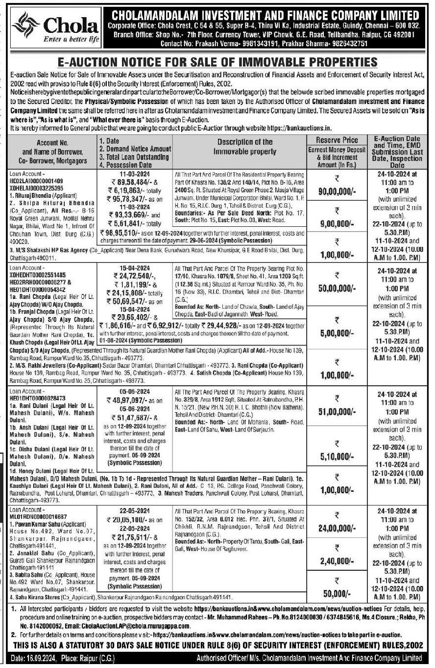 | Schedule of Property: | All That Part And Parcel C1 The Property Bearing Plot No 17/10 Khasra No 1079/8, Sheet No 41. Area 1209 Sq ft (112.36 Sq.mt) Situated at Ramour Ward No. 35, Ph No 16 (Now 33), R.I.C. Dhamtari, Tehsil and Dist- Dhamtari (C.G.)Bounded As: North- Land of Chawla, South- Land of Ajay Chopda, East-Badio Jagannath West-Road |