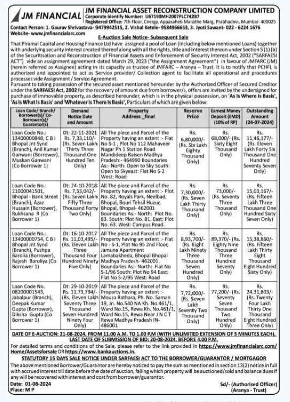 | End Date and Time of Auction: | 21-08-2024 1:00 pm |
