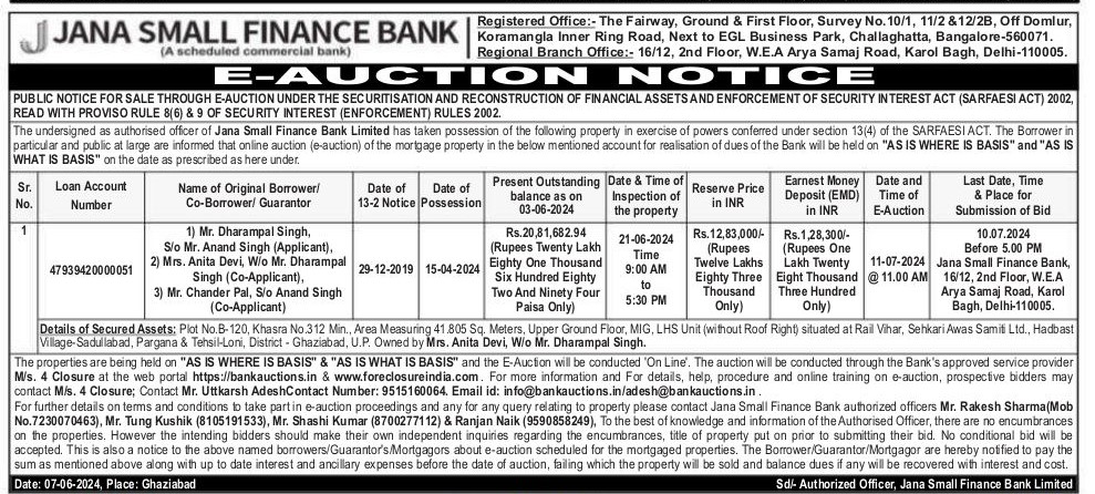 | Schedule of Property: | Details of Secured Assets: Plot B-120. Khasra 312 Min., Area Measuring 41.805 Sq. Meters, Upper Ground Floor, MIG, LHS Unit (without Roof Right) situated at Rail Vihar, Sehkari Awas Samit Ltd., Hadbast Village-Sadullabad, Pargana and Tehsil-Loni, District - Ghaziabad, U.P. Owned by Mrs. Anita Devi, W/o Mr. Dharampal Singh. |