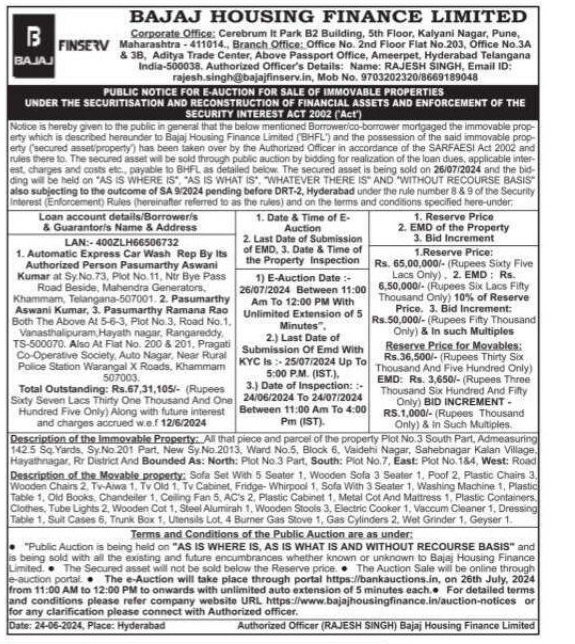 | Contact Details: | Contact The Authorized Officer Phno : Rajesh singh 9703202320/ 8669189048 Email Id : rajesh.singh@bajajfinserv.in |