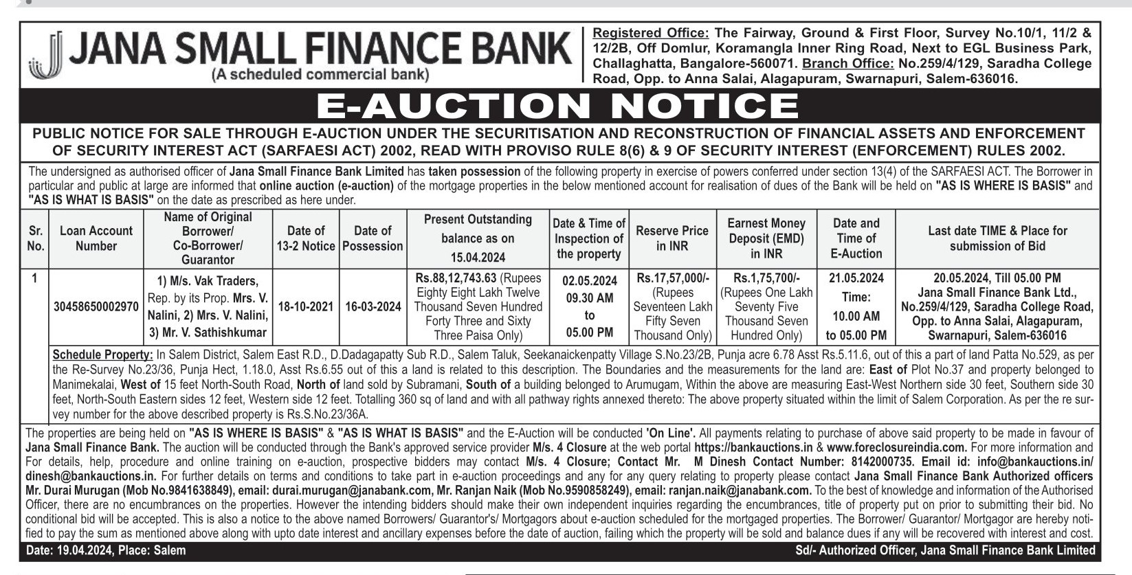 | Contact Details: | Contact Authorized Officer : Mr.Durai Murugan ,Mob.No.:9841638849, Mr. Ranjan Naik, Mob.No.:9590858249 |